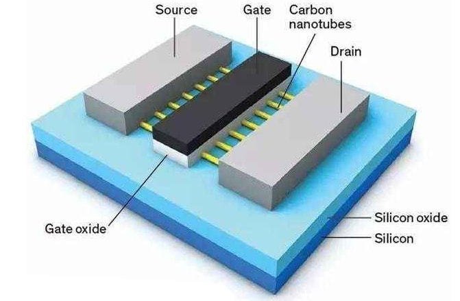 在CNFET中,源極和漏極之間的溝道由碳納米管組成,其直徑僅有1–3 nm, 意味著其作為晶體管的溝道更容易被柵控制。因此, 碳納米管晶體管比傳統(tǒng)硅基晶體管在比例縮減上的潛力會更大。